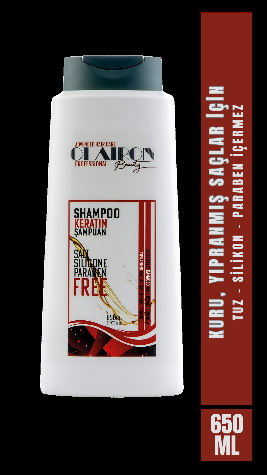 Keratin Şampuan Salt-Paraben-Sulfate FREE 650ml|Yıpranmış Saçlar İçin Onarıcı Şampuan|CLAIRON BEAUTY Şampuan Keratin içeriği ile saçların dış etkenlere karşı korunmasına ve güçlenmesine yardımcı olur. Tuz, silikon,Paraben içermeyen formülü ile saç v